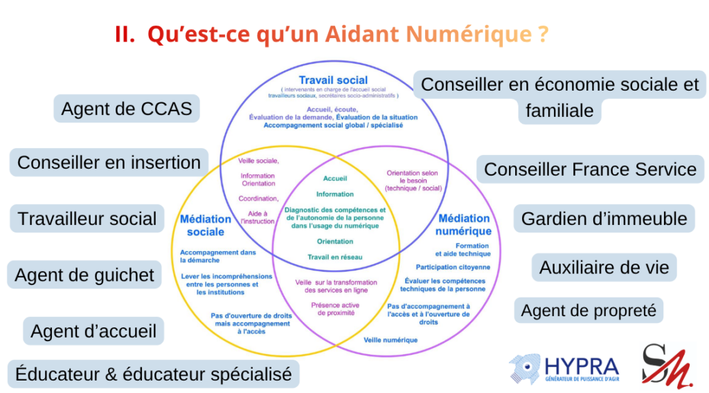 Les aidants numériques sont l’ensemble des professionnels du champ social, médico-social, de l’éducation populaire et de l’animation culturelle et socio-culturelle. Il peut s’agir de :